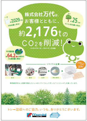 万代では、2025年2月期において使用済み食品トレーを483t回収し、回収資源から再生されたエコ製品を売り場で使用することによって、2,176tのCO2排出量を抑制いたしました。