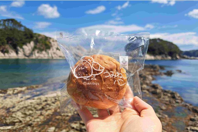 船内で販売しているこの「うみねこパン(200円)」の製造は、現在の「宮古うみねこ丸」の就航以来、障害者就労支援事業所「SELPわかたけ」が担っており、人が食べても美味しく頂けるように作られています。海藻も混ぜ込まれているため、ほんのり海の香りがしてどこか懐かしさを感じるパンです。乗船しないと購入できないため、お土産に持ち帰っても話題が広がります。パッケージのイラストは、アートで岩手宮古を元気に!をコンセプトに、姉が社長で妹が社員の小さな会社「ArtEriy's」が手掛けています。
