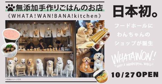 無添加の手作りごはんを提供する《WHATA!WAN!BANA!kitchen》が、ワタワン内の大空間フードホール「Gourman’s(グルマンズ)」に2024年10月27日より新規オープンいたします!わんちゃんの健康を第一に考え、安心・安全な食材を使用した特製メニューを揃えました。