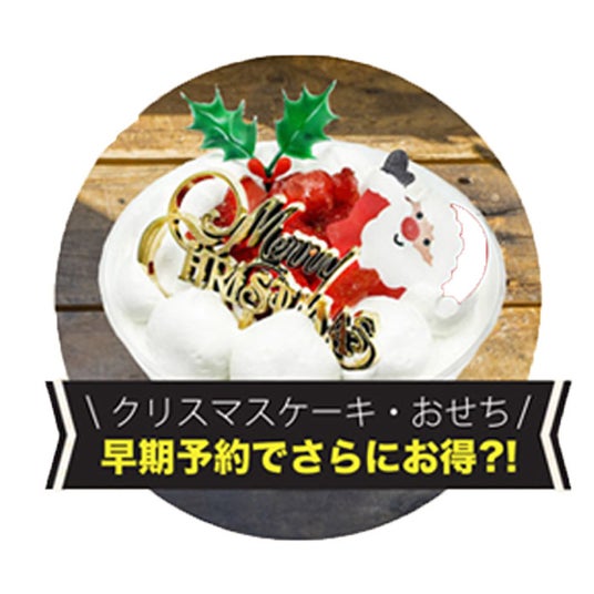 クリスマスケーキ・おせち 早期予約割りキャンペーン 無添加クリスマスケーキ・おせちを早期予約していただくと、お得な割り引き価格でご購入いただけます!数量限定のため、お早めにご予約ください!