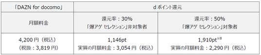 さらに「DAZN for docomo」の月額料金(税抜)の20%のdポイント(期間・用途限定)(※3)(※4)を還元する「爆アゲ セレクション(※5)」対象のお客さまは、本キャンペーンの30%還元と合わせて最大3か月間、毎月50%のdポイント(期間・用途限定)が還元されます。詳細は「DAZN for docomo」サービスサイトをご確認ください。