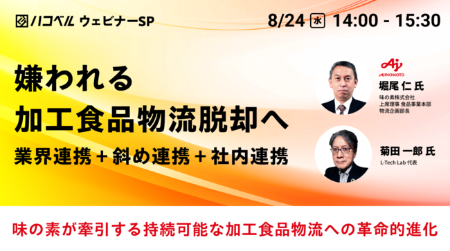 物流プラットフォーム「ハコベル」を展開するハコベル株式会社(本社:東京都品川区、代表取締役社長CEO:狭間 健志、以下:ハコベル)は8月24日(水)に、味の素株式会社 上席理事 食品事業本部 物流企画部長 堀尾 仁氏、L-Tech Lab代表 菊田 一郎氏をお迎えし「【味の素・堀尾物流企画部長ご登壇】“嫌われる加工食品物流”脱却へ、業界連携+斜め連携+社内連携」を開催することをお知らせいたします。