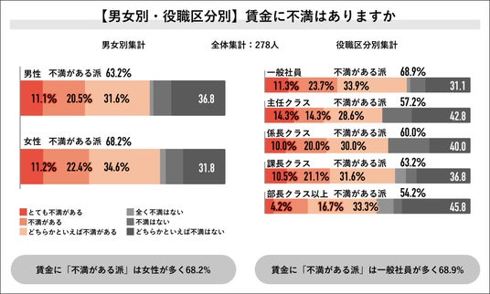 ・「賃金に不満がある派」の男女別では女性が68.2%、役職別では一般社員が68.9%で顕著
