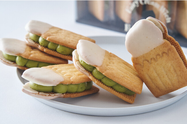 宇治抹茶生チョコ仕立ての生バタークリームとホワイトチョコレートチップを、丁寧に焼き上げた香ばしいビスケットで一つ一つサンド。クリームのなめらかな口溶けに、粒チョコ食感のアクセントが特徴の“特製生バターサンド”です。