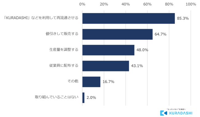 フードロス削減のための取り組みとして、「KURADASHIなどを利用して再流通させる」と回答した企業が85.3%
