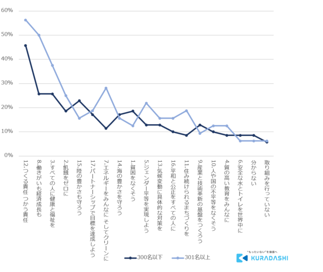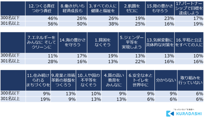 従業員数別で項目を比較すると、「8.働きがいも経済成長も」では300名以下が26%、301名以上が50%と、約2倍もの差が表れています。また、「7.エネルギーをみんなに そしてクリーンに」「11.住み続けられるまちづくりを」でも、301名以上が300名以下の2倍以上「取り組みを行っている」と回答し、従業員数によって取り組み内容に差が見られました。