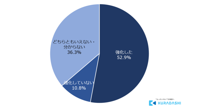 約半数の52.9%の食品事業者が「強化した」と回答しました。新型コロナウイルス感染拡大によって、ホテルや飲食店の営業自粛やインバウンド需要の減少、生活様式の変化が起こり、食品事業者は大きな影響を受けました。クラダシでは、そのような変化で販売先を失った業務用商品についての問い合わせが増え、「KURADASHI」で取り扱う「業務用商品」の数も増加しました。
