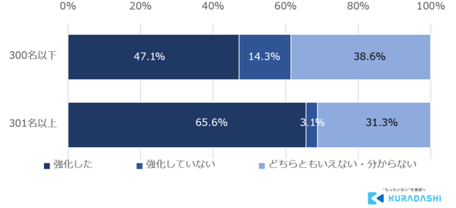 「強化した」の割合が、300名以下が47.1%であるのに対して、301名以上は65.6%と、大手企業の方がより新型コロナウイルス感染拡大をきっかけにフードロス削減への取り組みを強化した傾向にあると言えます。