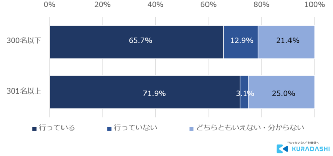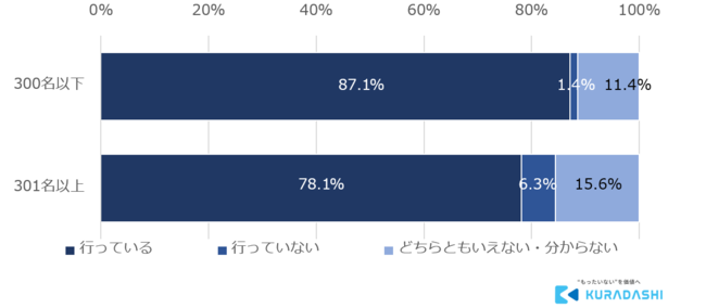 従業員数別で比較すると、300名以下では「行っていない」と回答した割合が12.9%、301名以下では3.1%と、約10%の差が見られました。
