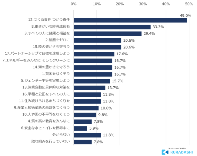 SDGs目標達成に向けた取り組みとして該当する項目は「12.つくる責任 つかう責任」が最も多く49%