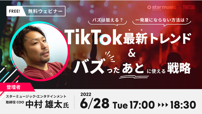 そこで、本セミナーでは音楽を中心としたコンテンツを軸にエンタテインメントに関する幅広いソリューションを提供し、総フォロワー数2億人の国内最大級MCN「Star Creation」の運営やマーケティングソリューションを提供している株式会社スターミュージック・エンタテインメントの取締役COO 中村雄太氏をお招きして、「TikTokの最新トレンドから実践的なテクニック」について解説いたします。