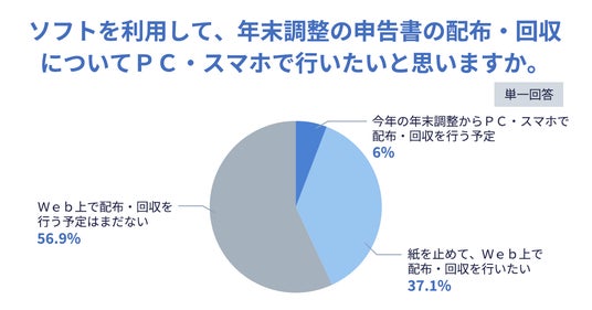 昨年度まで、紙で年末調整の申告書の配布・回収していた企業のうち、今年からソフトを利用し、PC・スマートフォンによる、配布・回収を行う予定、または今後Web上での配布・回収を実施したいと答えた担当者は43.1%でした。特に従業員数が多い企業ほど、Web対応への意向が強く、30名以上の会社では過半数が、50名以上の会社では6割以上がWeb対応を検討しています。