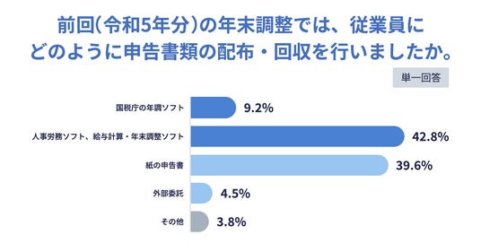 また、従業員にどのように申告書類の配布・回収を行ったか聞いたところ、給与計算ソフトの利用が42.8%、国税庁の年末調整ソフトの利用が9.2%と、合わせて5割以上がソフトを活用していることが明らかとなりました。従業員100名以下の中小企業においても、ソフトの利用がスタンダードになっている状況が伺えます。