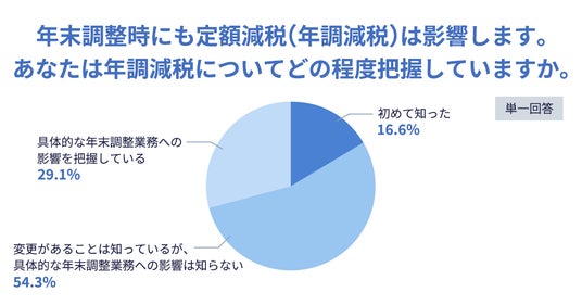 今年度は年末調整時にも定額減税(年調減税)の影響があります。対象者にその認知について確認したところ、具体的な影響を把握していると回答した人は全体の29.1%と約3割にとどまり、残りの約7割は具体的には知らない、または今回の調査で初めて知ったと答えました。