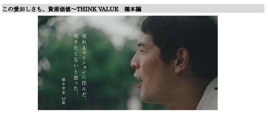 新CMでは、生活者とともに、真の「資産価値」を考えていきたいといった想いを込めて「資産価値をあなたと考える。」をコミュニケーションワードとしました。