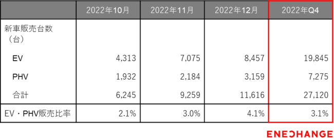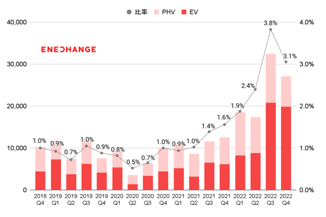 当社では、EV充電エネチェンジとしてEV充電サービスを展開しており、その成長には国内のEVの本格普及が重要であることから、EVおよびPHVの新車販売比率を重要指標と捉えています。当社試算では、2022年第4四半期(10月~12月)のEV及びPHVの新車販売比率は、全体の販売台数の約3.1%となりました。一部の国内EVメーカーで、一時的なEV販売停止などの影響がありましたが、その後の販売再開により、12月単月では4.1%と過去最高となりました。