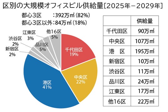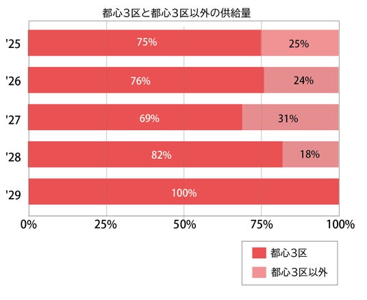 ・過去5年間と今後5年間の供給割合を区ごとに集計したところ、過去5年間で7割を占めていた都心3区(千代田区・中央区・港区)の割合が、今後5年間では8割に増加しています。都心3区の内訳では、千代田区・港区の割合が減少する一方で、中央区の割合が大きく増加しました。