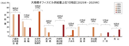 ・地区別の集計では、過去5年間の供給の中心であった「虎ノ門・新橋」「大手町・丸の内・有楽町」に代わり、今後5年間では「八重洲・日本橋・京橋」「白金・高輪」における供給が中心となります。29年においては、「白金・高輪」「内幸町・霞が関・永田町」「青山」等過去5年間で圏外だったエリアが複数含まれており、開発エリアの多様化が進んでいます。