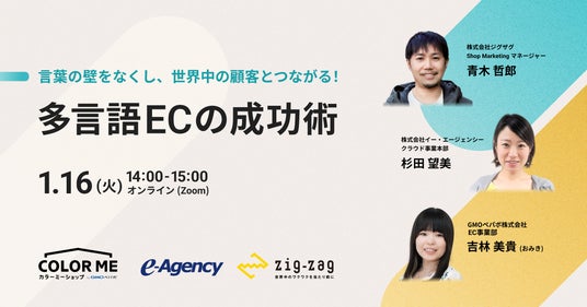 海外販売支援サービス「WorldShopping BIZ」を提供する株式会社ジグザグ(本社:東京都渋谷区、代表取締役:仲里一義)は、2024年1月16日(火)に、株式会社イー・エージェンシー(本社:東京都千代田区、代表取締役:甲斐真樹)、ECカート構築サービス「カラーミーショップ byGMOペパボ」を提供する、GMOインターネットグループのGMOペパボ株式会社(代表取締役社長:佐藤 健太郎)と、オンラインセミナー「言葉の壁をなくし、世界中の顧客とつながる!多言語ECの成功術」を開催します。
