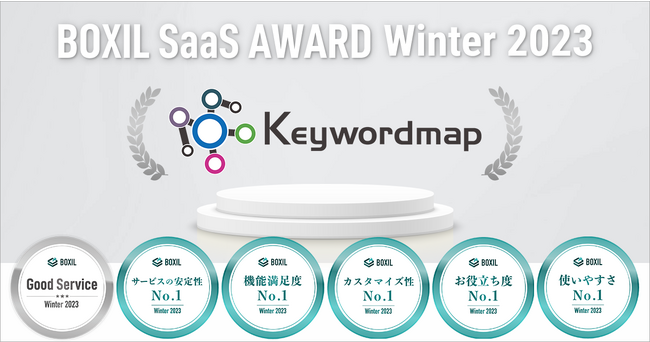 「BOXIL SaaS AWARD(ボクシル サース アワード)」は、SaaS(※1)比較サイト「BOXIL SaaS(ボクシル サース)」を運営するスマートキャンプが、優れたSaaSを審査、選考、表彰するイベントです。今回の「BOXIL SaaS AWARD Winter 2023」は、2022年10月1日から2023年9月30日までの1年間で「BOXIL SaaS」へ新たに投稿された口コミ約18,000件を審査対象としています。今回「Keywordmap」は「SEOツール部門」で「Good Service」・「サービスの安定性No.1」・「機能満足度No.1」・「カスタマイズ性No.1」「お役立ち度No.1」・「使いやすさNo.1」に選ばれました。