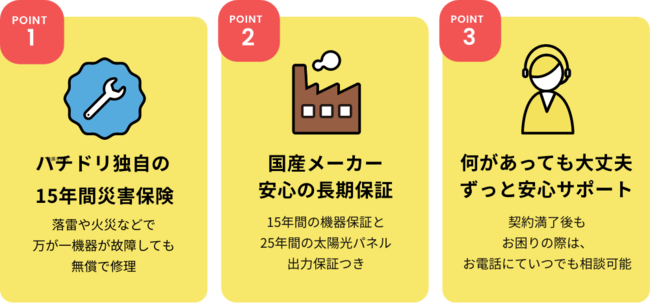 国産パネルメーカーならではの長期保証。15年間の機器保証と25年間の太陽光パネル保証がついております。
