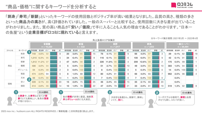 本レポートでは、角上魚類の全国の店舗から計22店舗を抽出、各店舗に寄せられた口コミ約2万件を分析しました。