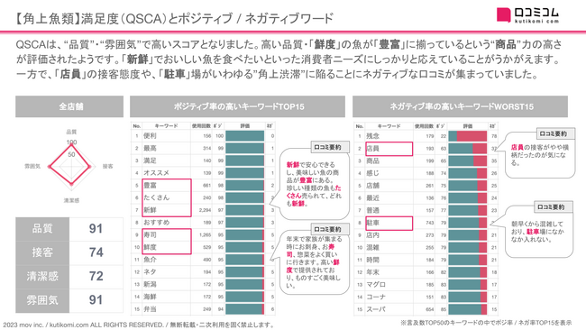 QSCAは、“品質”・“雰囲気”で高いスコアとなりました。高い品質・「鮮度」の魚が「豊富」に揃っているという“商品”力の高さが評価されたようです。「新鮮」でおいしい魚を食べたいといった消費者ニーズにしっかりと応えていることがうかがえます。一方で、「店員」の接客態度や、「駐車」場がいわゆる”角上渋滞”に陥ることにネガティブな口コミが集まっていました。
