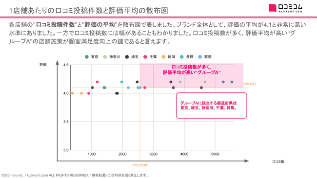 各店舗の”口コミ投稿件数”と”評価の平均”を散布図で表しました。ブランド全体として、評価の平均が4.1と非常に高い水準にありました。一方で口コミ投稿数には幅があることもわかりました。口コミ投稿数が多く、評価平均が高い“グループA”の店舗施策が顧客満足度向上の鍵であると言えます。