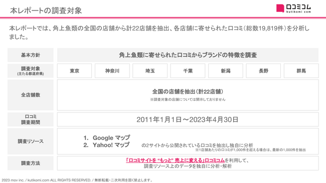 本レポートでは、角上魚類の全国の店舗から計22店舗を抽出、各店舗に寄せられた口コミ(総数19,819件)を分析しました。