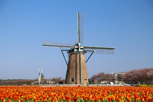 オランダ風車がシンボルの佐倉ふるさと広場では、春、一面のチューリップ畑が広がります。今年は、“香る”“移り色”“斑入り”など珍しい品種を含んだ約100種・70万本のチューリップを楽しめします。