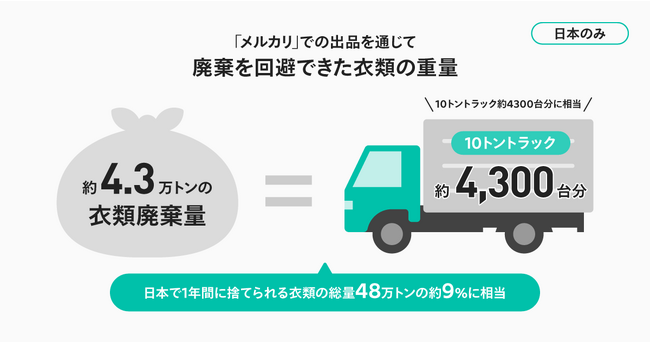 また、メルカリで不要品が出品されたことで回避できた衣類廃棄量(重量)は日本だけでも約4.3万トンでした。これは日本で1年間に捨てられる衣類の重量48万トンの約9%に相当します。(※7)