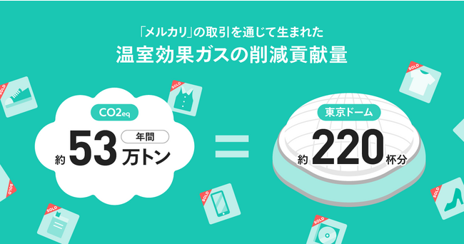「衣類(レディース・メンズ・キッズ・ベビー)」、「スニーカー(レディース・メンズ・キッズ)」、「電子機器(PC・スマートフォン・タブレット)」、「本・漫画・雑誌」、「CD・DVD・BD(ブルーレイディスク)」5つのカテゴリー(※2)を対象に削減貢献量の算出を行った結果(※3)、「メルカリ」を通じて日米合計で年間約53万トンの温室効果ガスの排出を回避できることがわかりました。これは東京ドーム約220杯分の容積に相当します。(※4)
