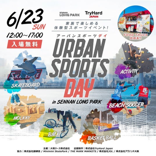 2024年5月19日(日)、SENNAN LONG PARK(センナンロングパーク)(所在地:大阪府泉南市)にて、開催を予定しておりました、スポーツイベント「URBAN SPORTS DAY in SENNAN LONG PARK」を2024年6月23日(日)に延期することをお知らせいたします。開催を心待ちいただいている皆様に、多大なご心配とご迷惑をおかけしますことを深くお詫び申し上げます。「URBAN SPORTS DAY in SENNAN LONG PARK」とは?