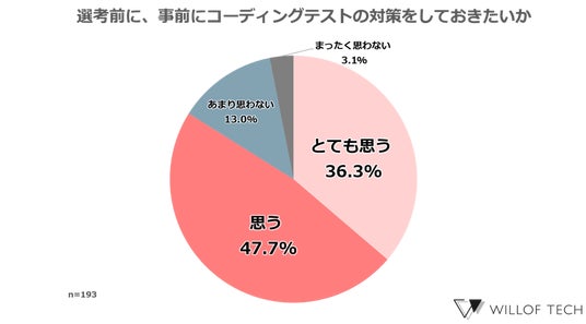 「コーディングテストの実施を求められたことがある」と回答した人に【選考前にコーディングテストの対策をしておきたいか】について聞いたところ、「とても思う」と回答した人が36.3%で、「思う」と回答した人が47.7%となり、合わせて84.0%の人が「事前に対策をしておきたい」と思っているということがわかりました。