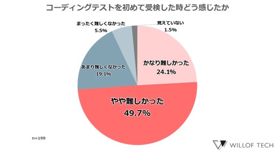 「コーディングテストの実施を求められたことがある」と回答した人に【コーディングテストを初めて受験した時、どう感じたか】について聞いたところ、 「かなり難しかった」と回答した人が24.1%で、「やや難しかった」と回答した人が49.7%となり、合わせて73.8%の人が「難しかった」と感じたことがわかりました。