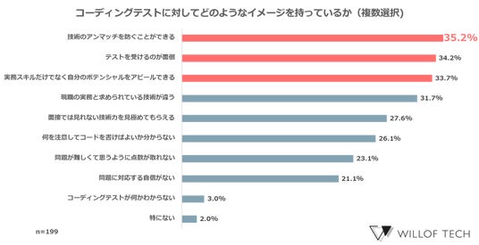また【コーディングテストに対してどのようなイメージを持っているか】についても聞いたところ「技術のアンマッチを防ぐことができる」と回答した割合が35.2%で最も多い結果となりました。一方で、「テストを受けるのが面倒」という回答が34.2%で2番目に多い結果となり、メリットを感じつつもコーディングテストの受験については正直面倒だと感じる人も多いということがわかりました。