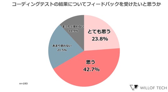 また、【コーディングテストの結果についてフィードバックを受ける機会があったら受けたいか】について聞いたところ、「とても思う」と回答した人が23.8%で、「思う」と回答した人が42.7%の結果となり、合わせて66.5%の人が「コーディングテストの結果についてフィードバックを受けたい」と思っているということがわかりました。