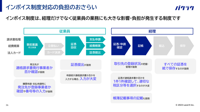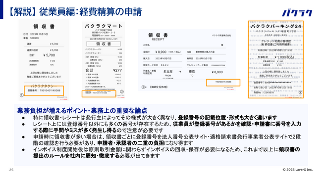 ワークショップを通じて制度開始に伴いどのような業務フローや負担の変化が生じるかの具体イメージをつけることができるのに加えて、あえてアナログでインボイス制度開始後の業務を体験することで、どこまで従業員に法対応業務をしてもらえるか・経理部門でどこまで法対応を精緻にするかなど、自社に合った現実的な運用イメージをつけることができるようになります。ぜひ経理チーム内でのワークショップや、従業員の方も含めた社内研修などにご活用ください。