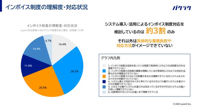実際に、弊社が経理担当者に実施したインボイス制度の理解度・対応状況の調査によると、システム導入・活用によるインボイス制度対応を検討している企業は約3割のみとなっており、過半数の経理担当者がインボイス制度開始後の具体的な業務負担や対応方法がイメージできていないという結果が出ています。