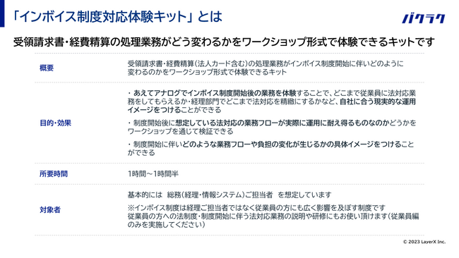 「インボイス対応 体験キット」は受領請求書・経費精算(法人カード含む)の処理業務がインボイス制度開始に伴いどのように変わるのかをワークショップ形式で体験できるキットです。