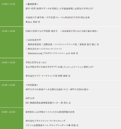 今回は、大学IRで先行する北海道大学の長谷山副学長に、最新の「データを基にした戦略的な大学経営」について基調講演をしていただきます。続いて、大学や民間企業の各登壇者より、CRMの活用や学習成果の可視化、教員評価システムの導入などについて発表いただきます。各大学の現場で課題の多いテーマから厳選しており、大学経営や教育改革に関わる方々にとって必見の内容となっております。