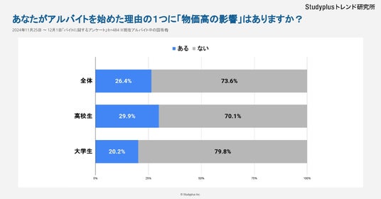 アルバイトを始めた理由の一つに「物価高の影響」があったかに関しては高校生の7割、大学生の8割は「ない」と回答しました。