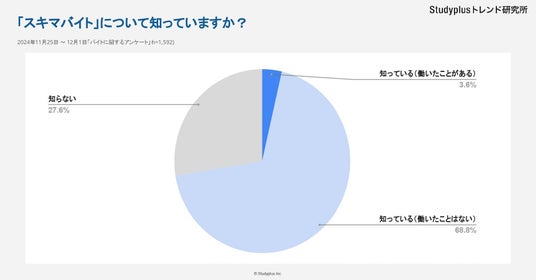 スキマバイトに関して、知っているかその上で働いたことがあるか聞いたところ「スキマバイトを知っていて働いたことがある」と回答した人は3.6%、「知っているが働いたことはない」と回答した人は68.8%、「知らない」と回答した人は27.6%となりました。