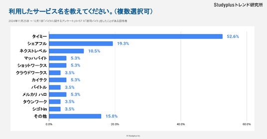 利用したサービス名を選択してもらったところ、「タイミー」が52.6%で一番多い結果となり、次に「シェアフル」の19.3%、「ネクストレベル」は10.5%となりました。