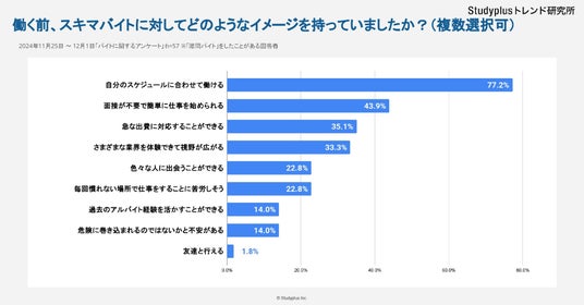 働く前のスキマバイトに対するイメージを聞いたところ「自分のスケジュールに合わせて働ける」が77.2%で一番多く、「面接が不要で簡単に仕事を始められる」が43.9%、「急な出費に対応することができる」が35.1%となりました。