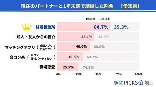 続いて、1年未満で結婚に至った人が出会ったきっかけを見てみると、「結婚相談所」がトップで64.7%と、「知人や友人からの紹介」「職場恋愛」を上回る結果となりました。