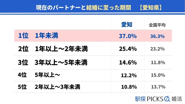 現在のパートナーと結婚相談所で出会った割合が最も高かった愛知県を対象に、結婚までに至った期間をたずねたところ、「1年未満」が37.0%、続いて「1年以上~2年未満(25.4%)」でした。