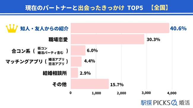全国20代~60代の既婚男女10,176人に、現在のパートナーとどこで出会ったのか調査を行った結果、1位は「知人や友人からの紹介(40.6%)」、2位は「職場恋愛(30.3%)」でした。