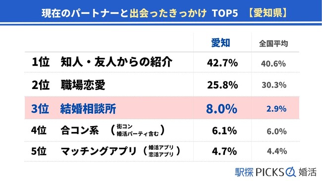 全国平均が2.9%であることから、愛知県(8.0%)は約3倍と他の地域よりも結婚相談所を利用してパートナーを見つけた人が多くなっています。
