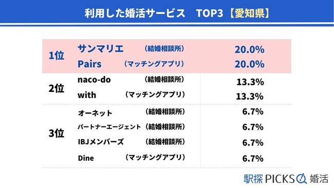 愛知県の人を対象に、利用した婚活サービスを聞いたところ、トップ3入りしたのは「結婚相談所」が5種類、「マッチングアプリ」が3種類。愛知の結婚相談所への信頼性がうかがえます。